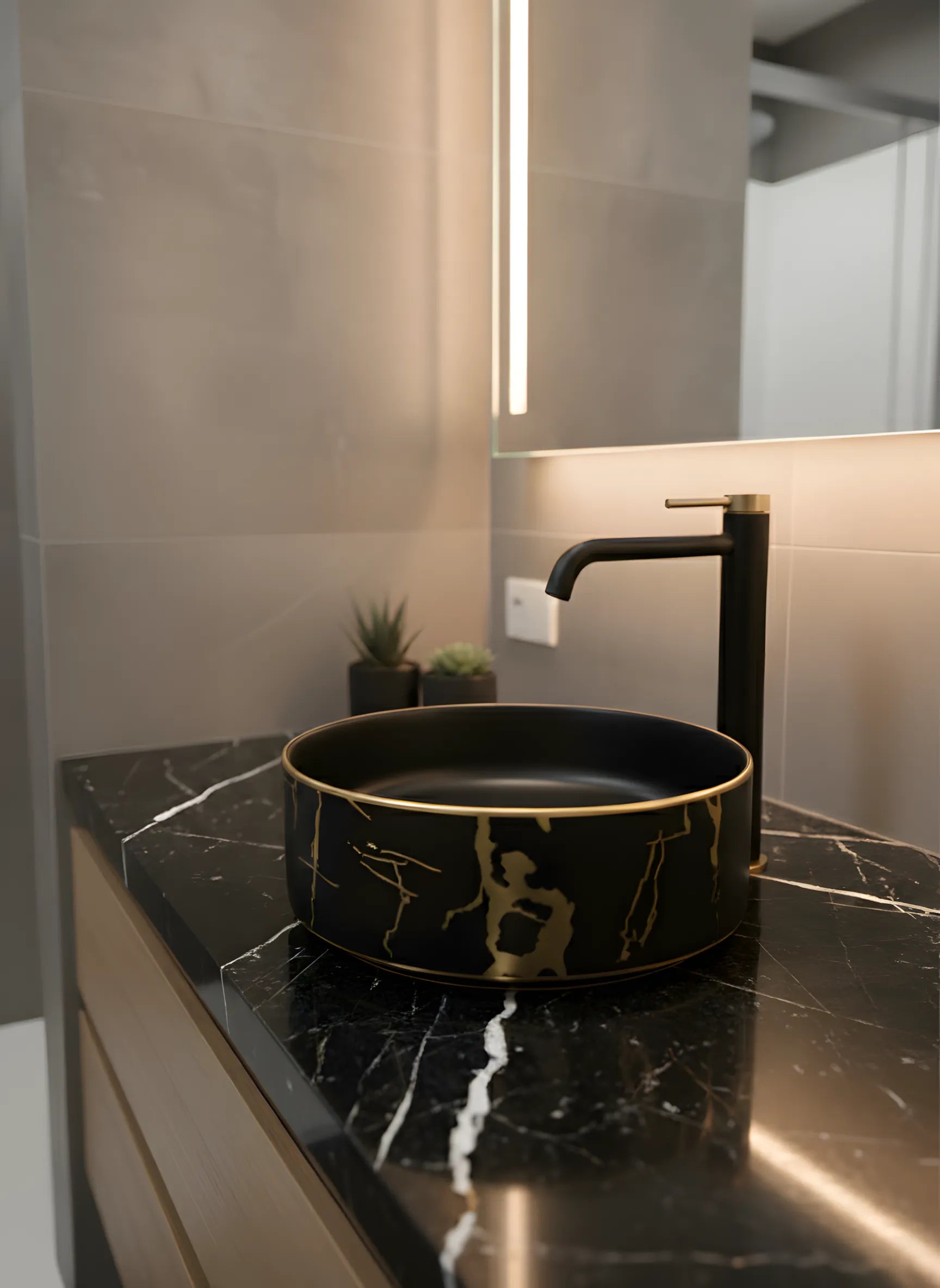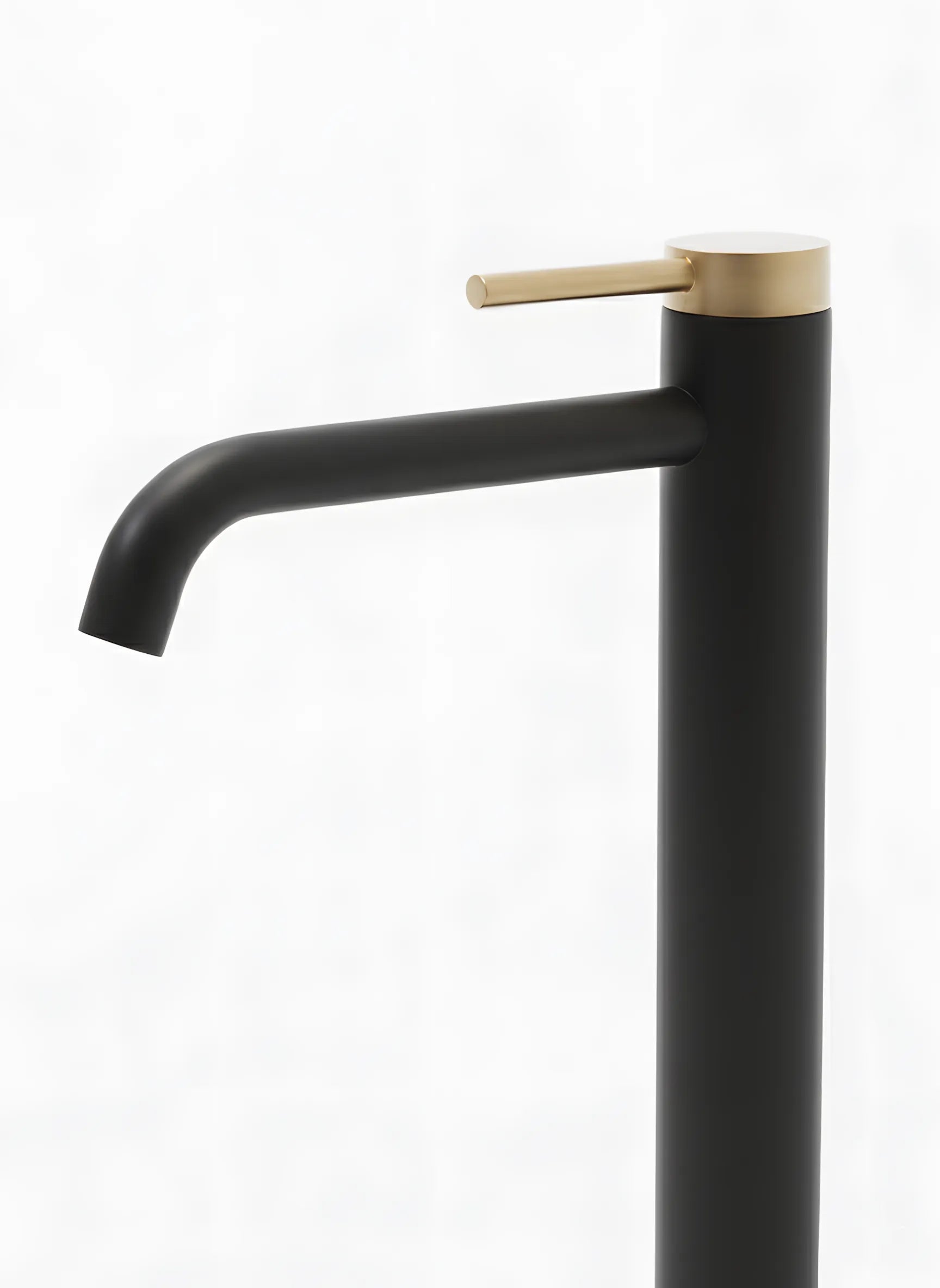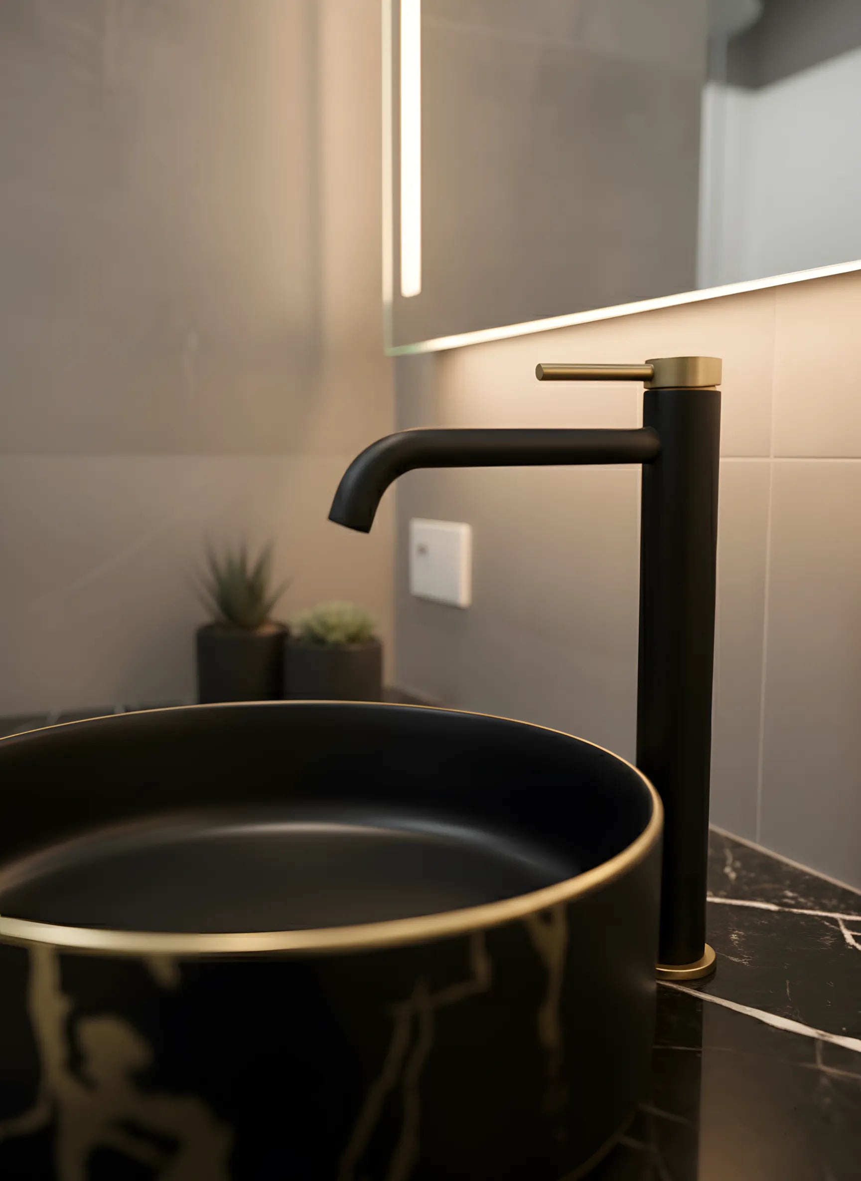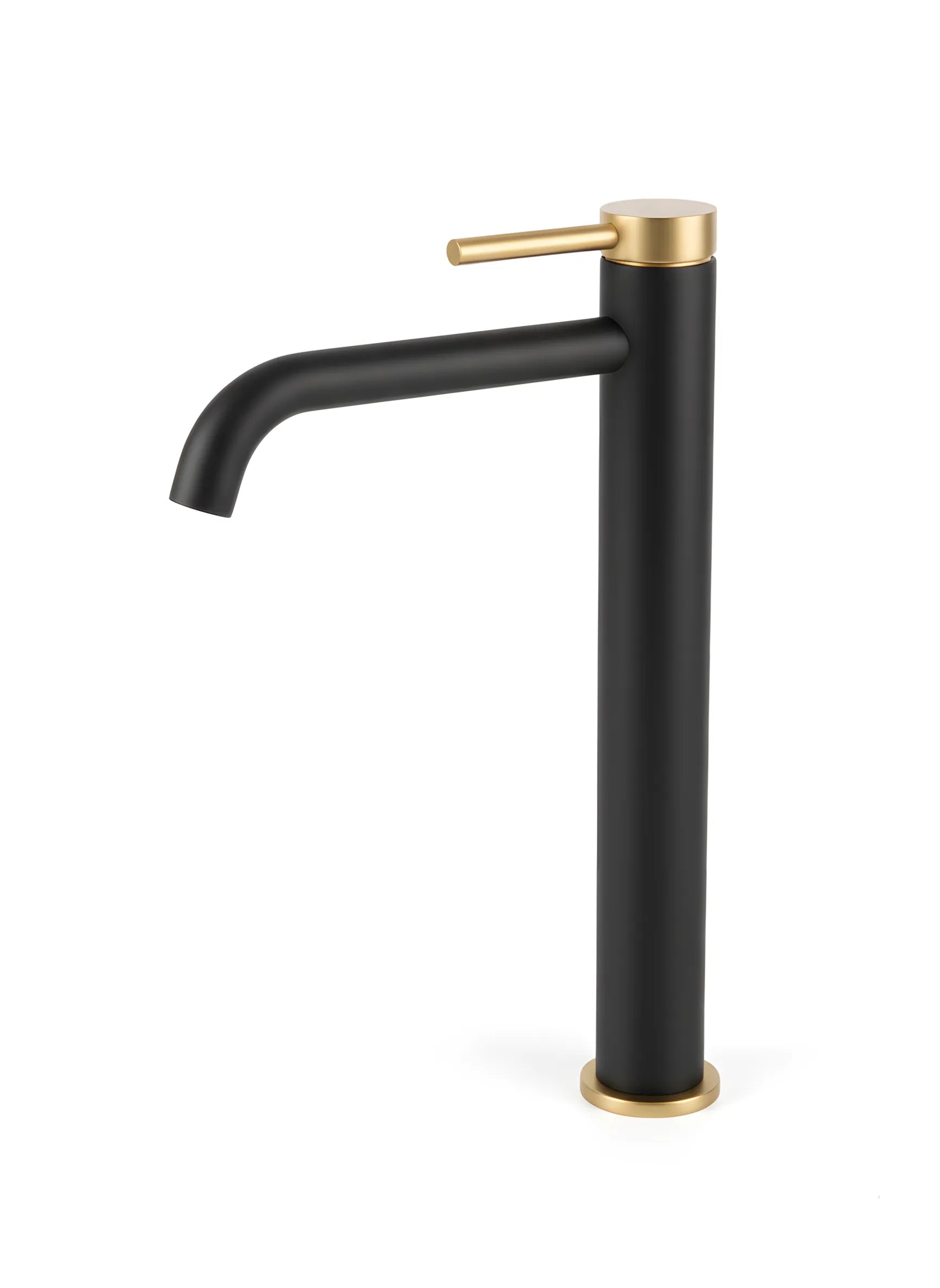 Baterie lavoar negru mat si auriu periat cu mâner zimțat