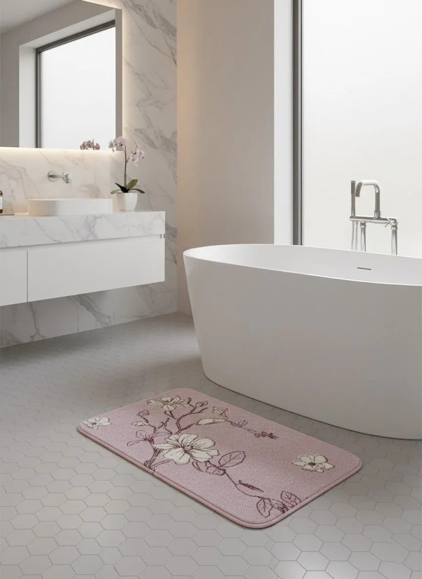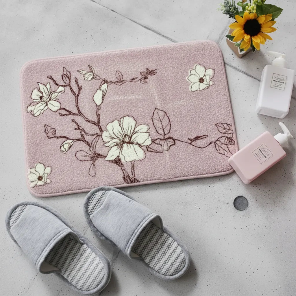 Covoraș baie absorbant, imitație cașmir, strat antiderapant, 40×60 cm, model floral Sakura