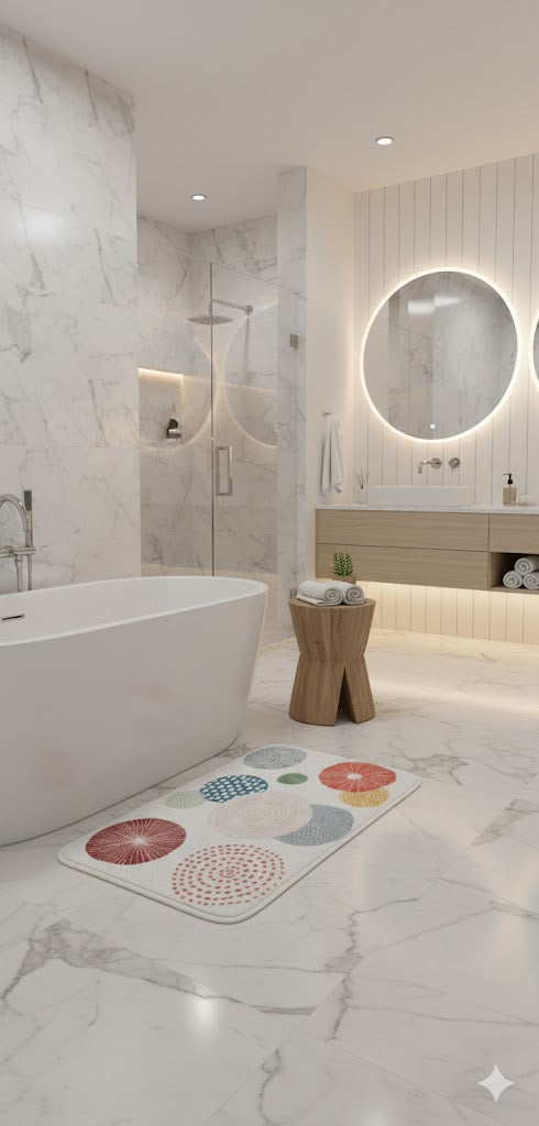 Covoras baie, SANITARY, imitatie casmir, 40x60 cm, alb cu cercuri decorative, Dreptunghiular