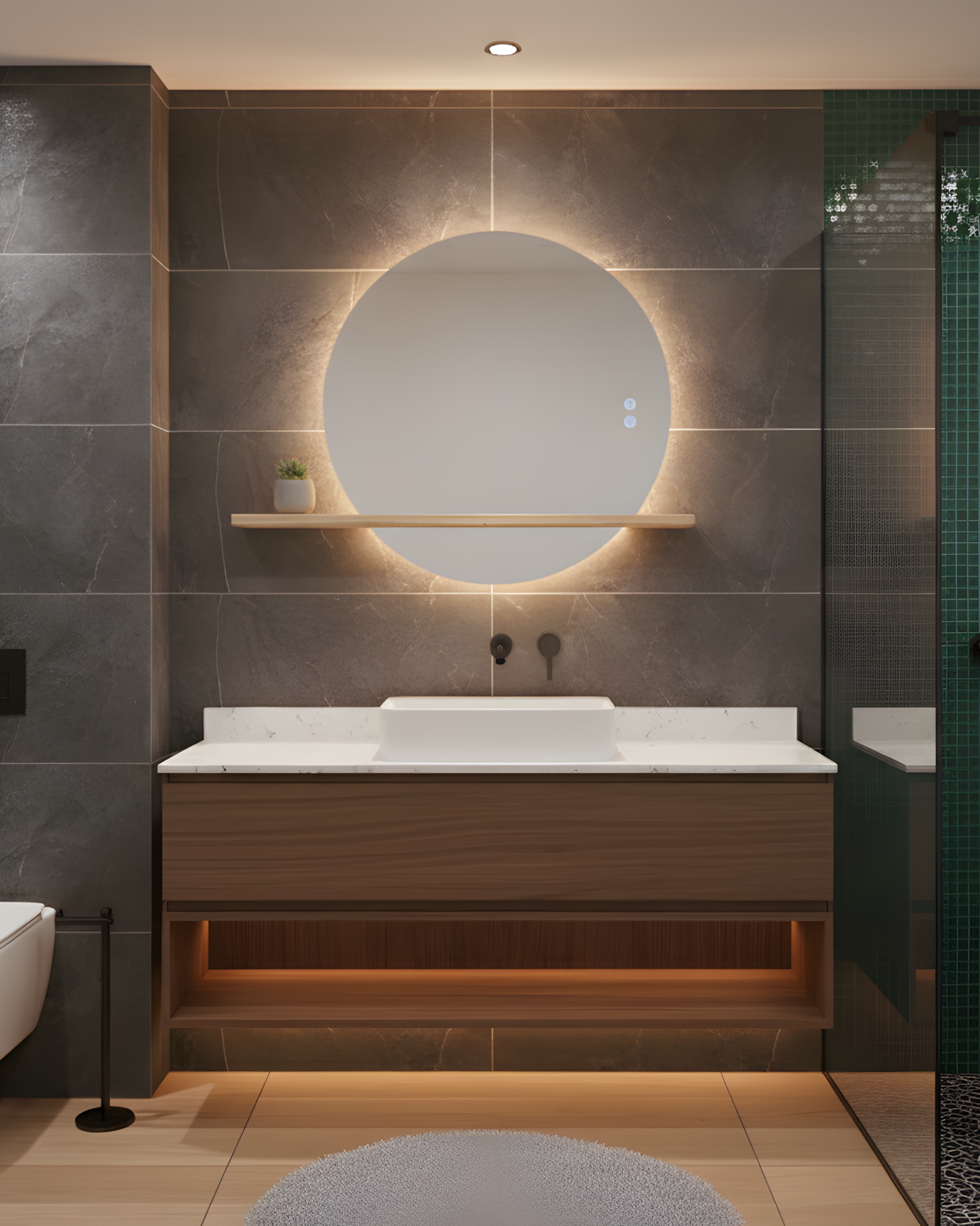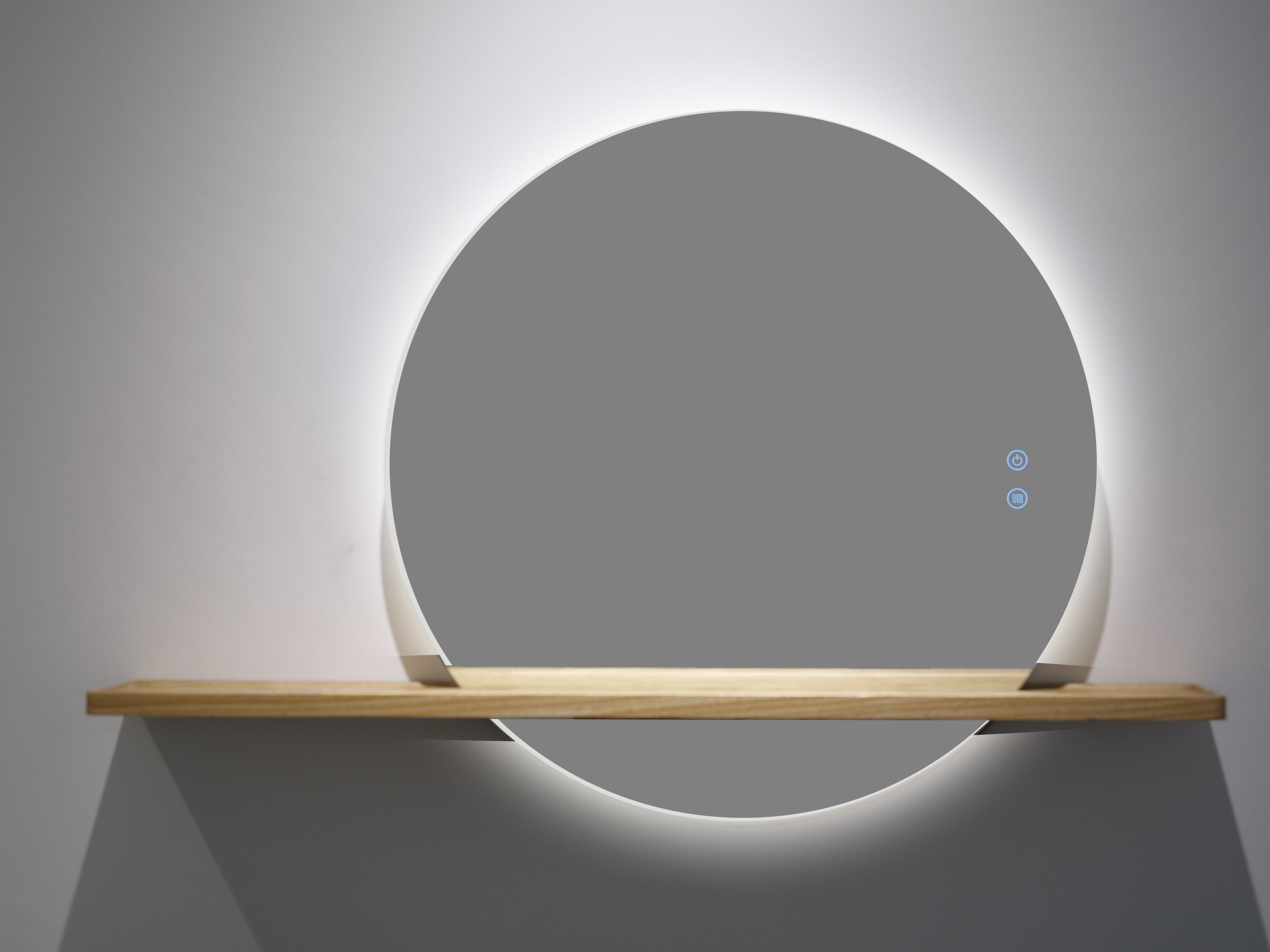 Oglindă Rotundă LED H-2004 cu Raft din Lemn – 3 Nuante de Lumină, Anti-Aburire, Touch Control