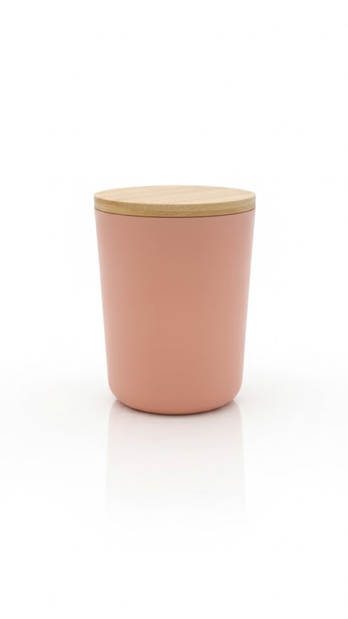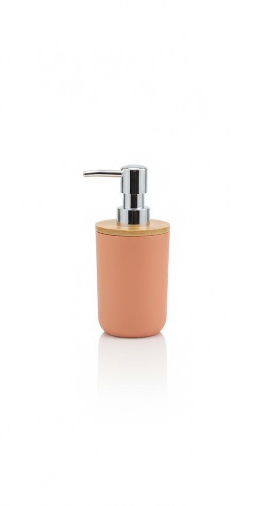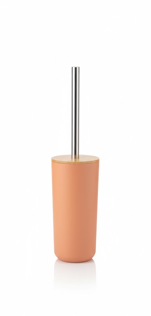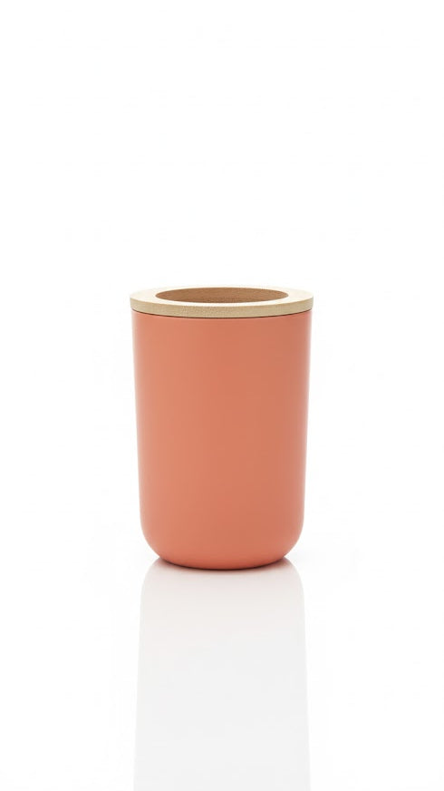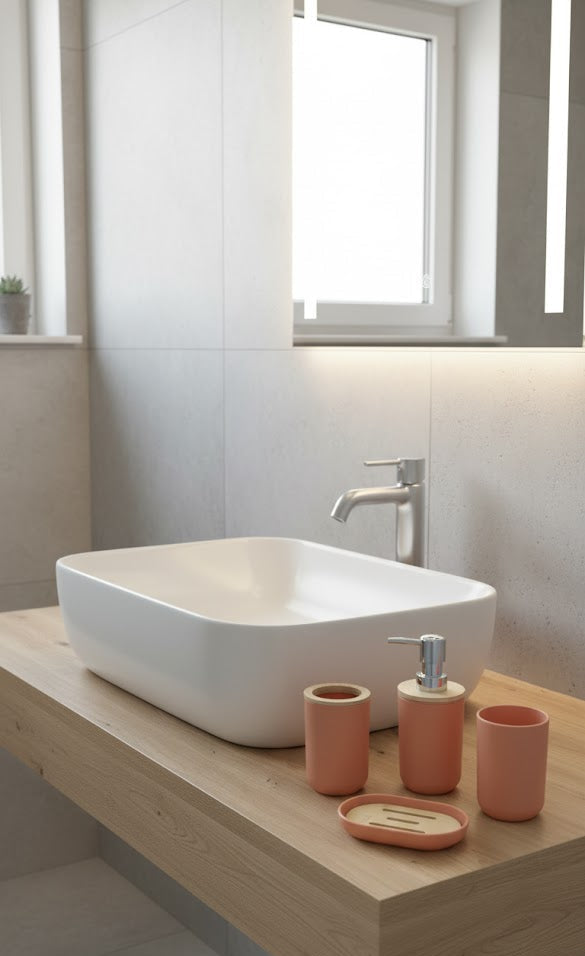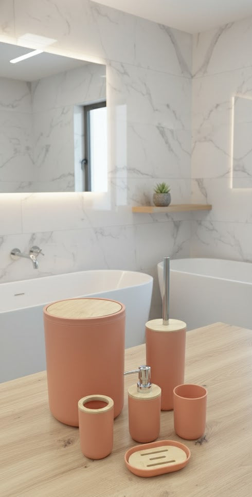 Set accesorii baie, cu accente lemnoase, SANITARY, 6 piese, somon cu detalii bej
