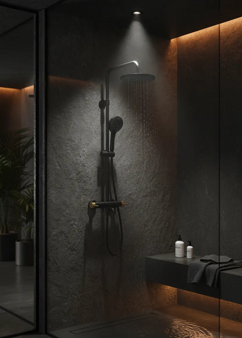 Setul de duș Royal Black & Gold impresionează prin combinația rafinată de negru mat și accente aurii. Cu design modern și detalii texturate, acest sistem transformă baia într-un spațiu elegant și funcțional, oferind o experiență completă prin dușul fix, dușul de mână și ciocul de cadă integrat.
