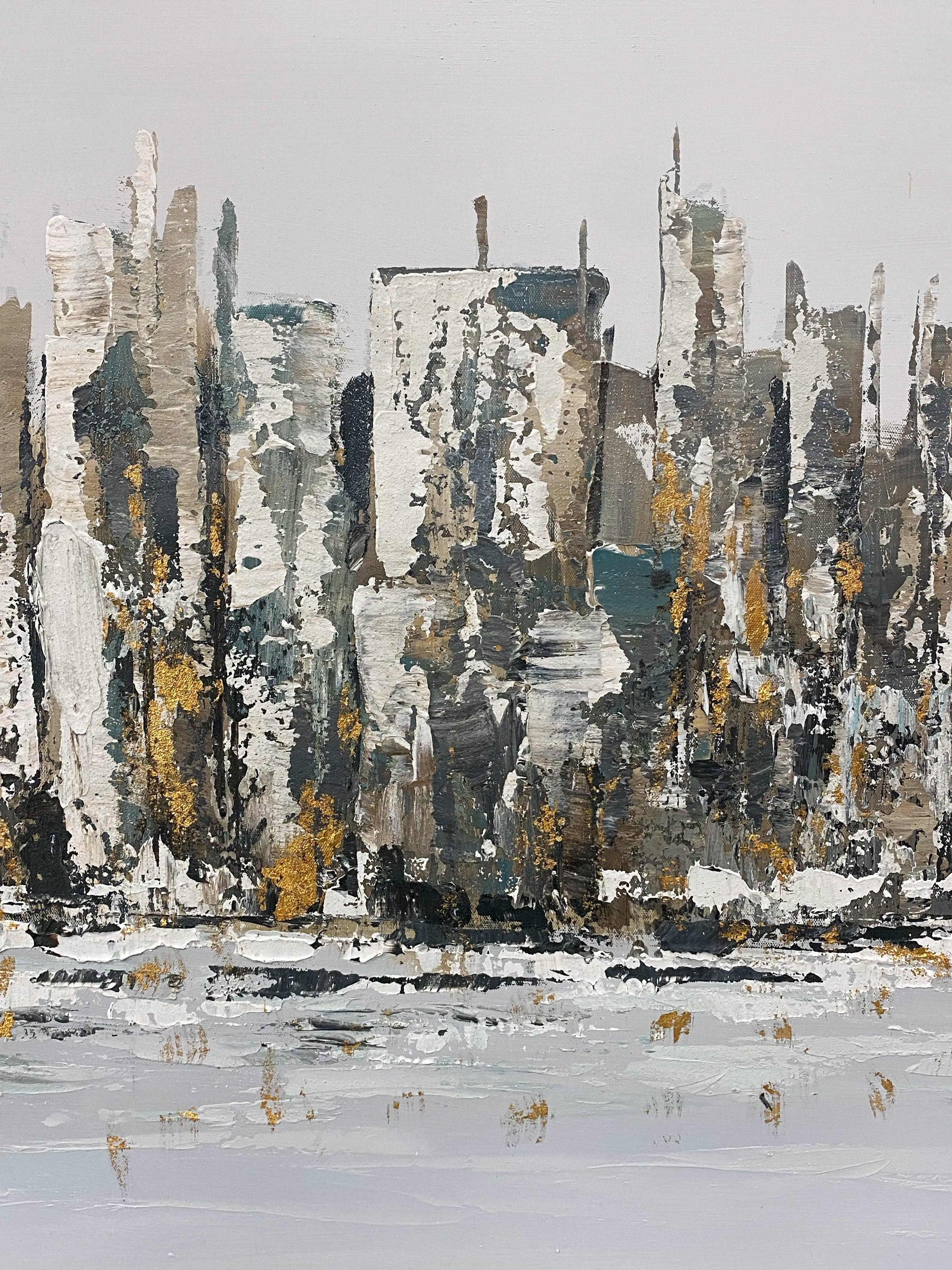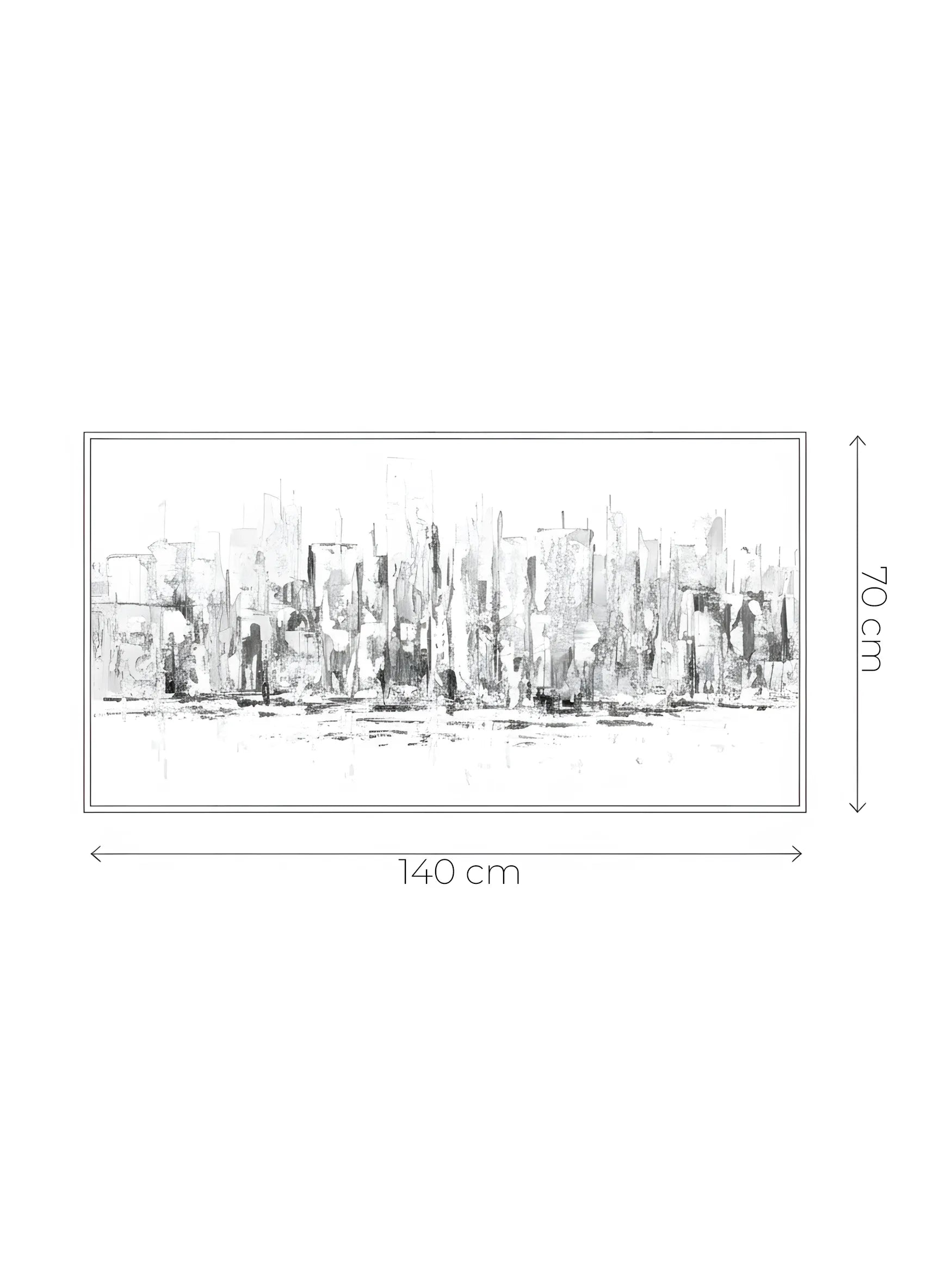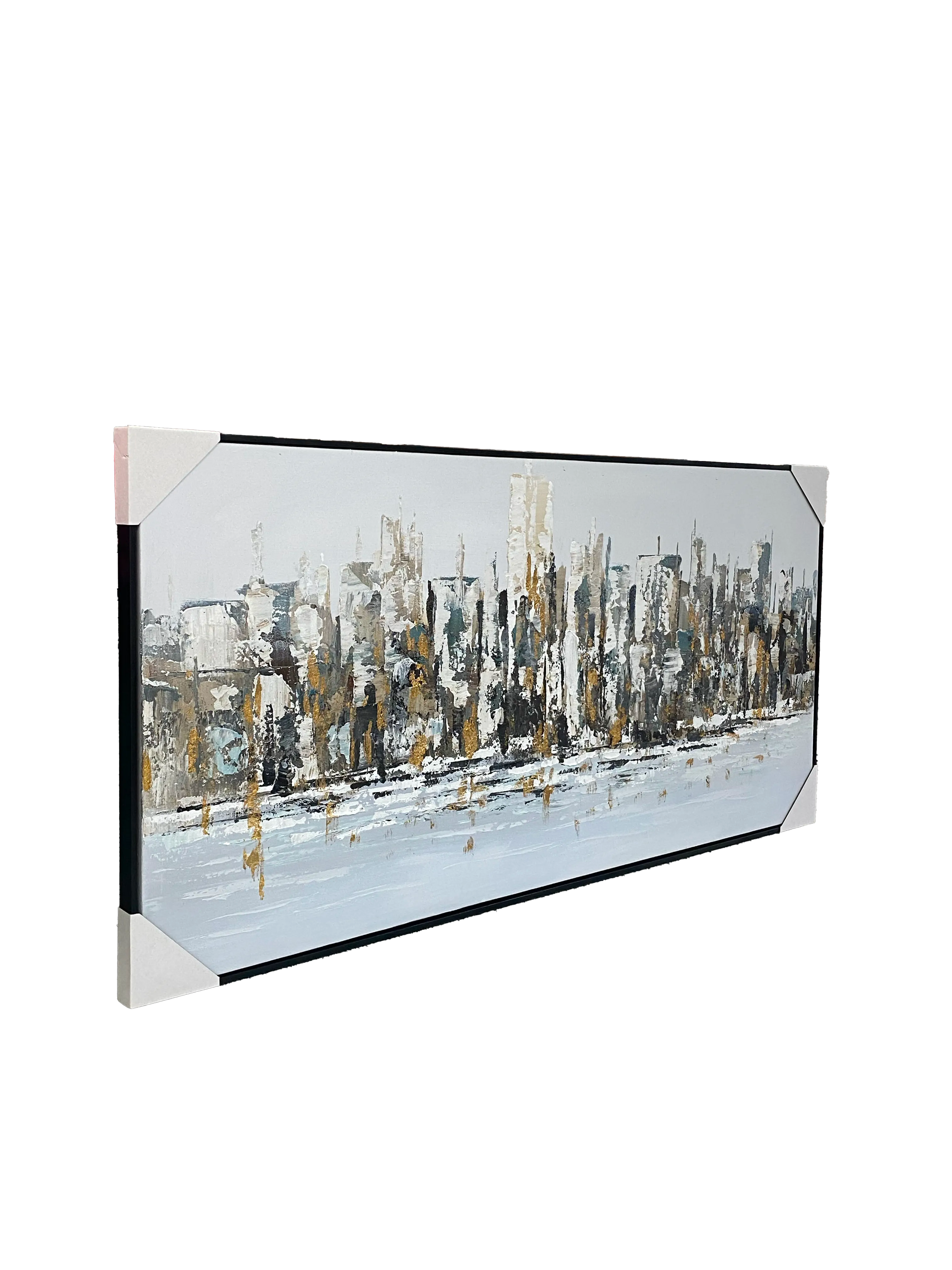 Tabloul panoramic de 70×140 cm face parte din colecția Golden Axis și surprinde un skyline urban realizat într-un stil abstract, cu detalii aurii aplicate manual. Jocul de lumini și umbre dintre nuanțele de gri, alb, negru și auriu creează o atmosferă rafinată, plină de contrast și energie, evocând eleganța marilor orașe moderne.