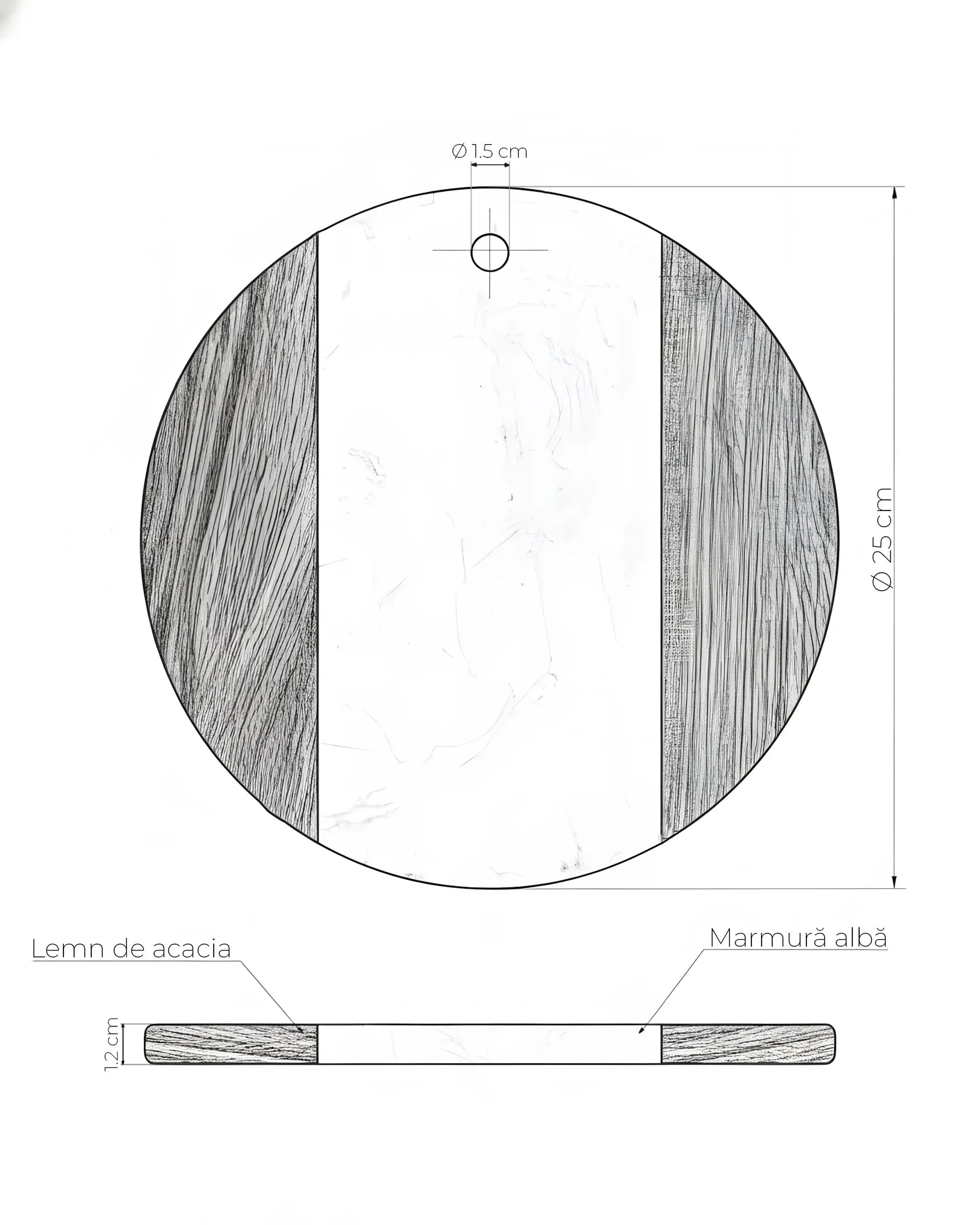 Acest tocător rotund combină durabilitatea lemnului de acacia cu eleganța marmurei albe, oferind o suprafață stabilă, igienică și rezistentă pentru prepararea sau servirea alimentelor. Lemnul de acacia este apreciat pentru durabilitatea sa naturală, iar marmura albă adaugă un plus de stil și rafinament.