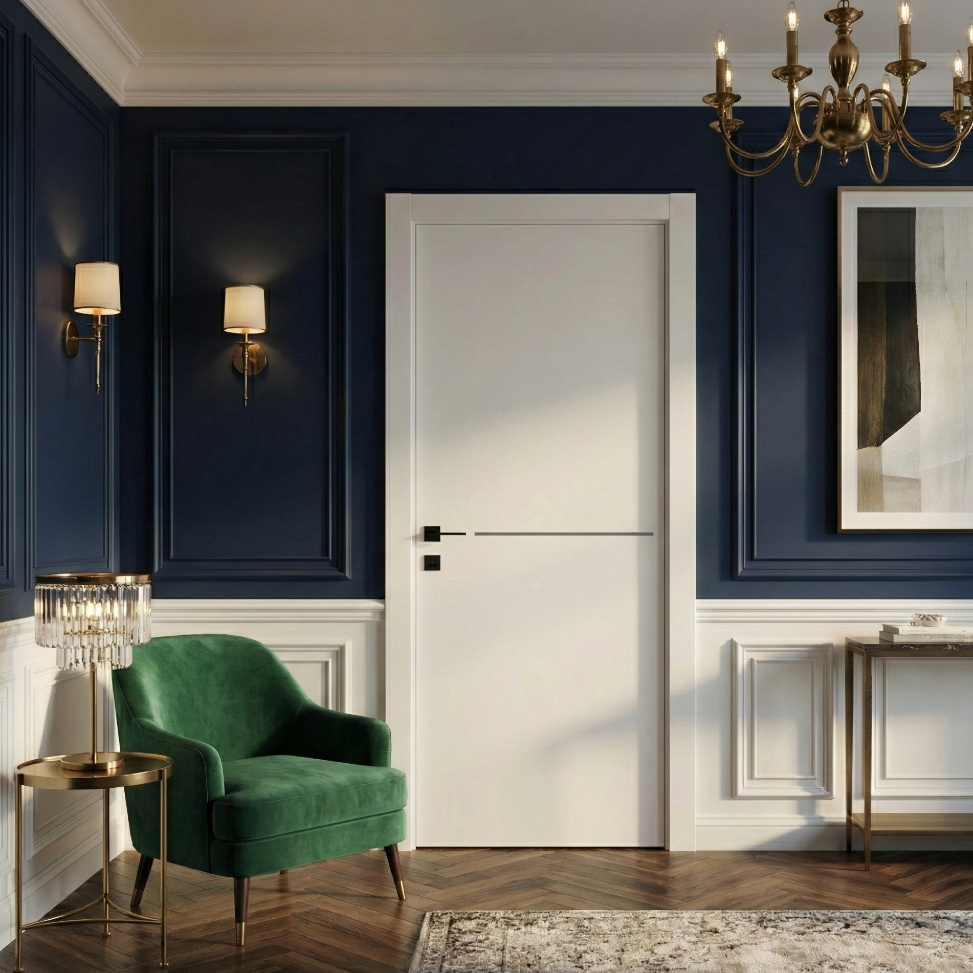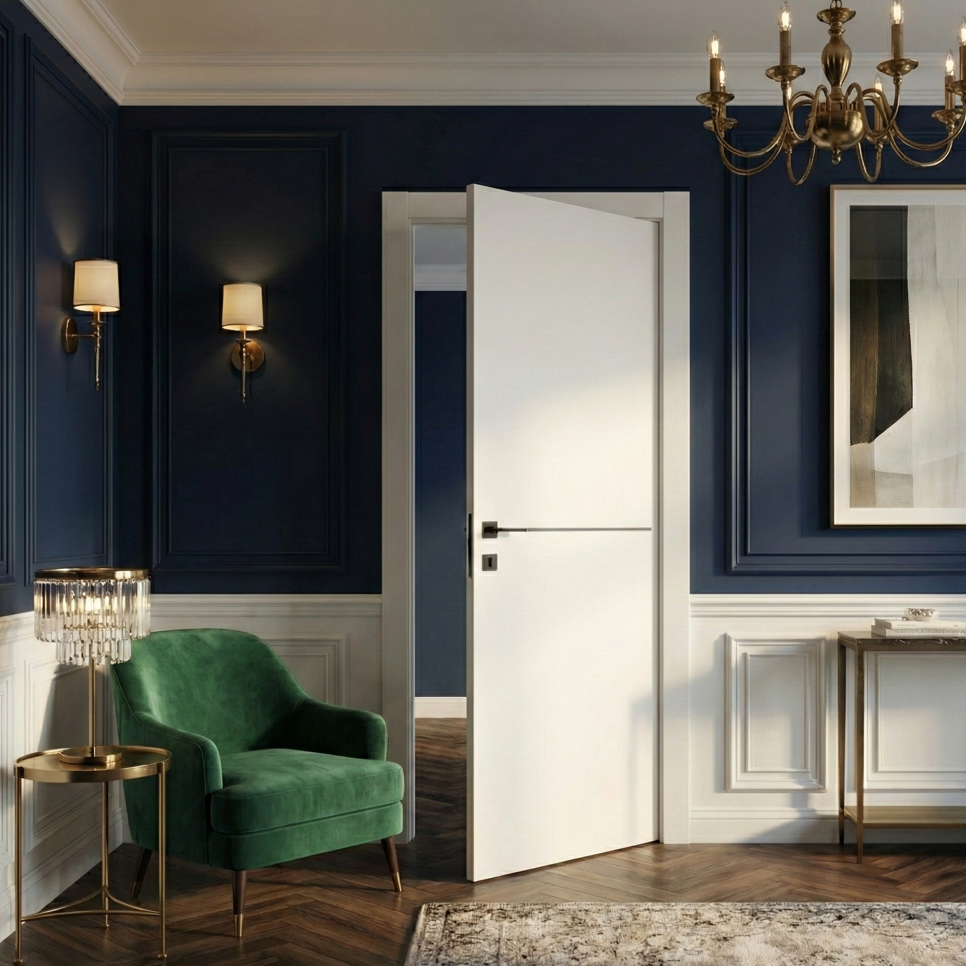 Foaia de ușă este realizată din HDF aplicat pe structură din lemn stratificat, oferind stabilitate în timp, rezistență la deformare și o suprafață perfectă pentru finisajul vopsit.