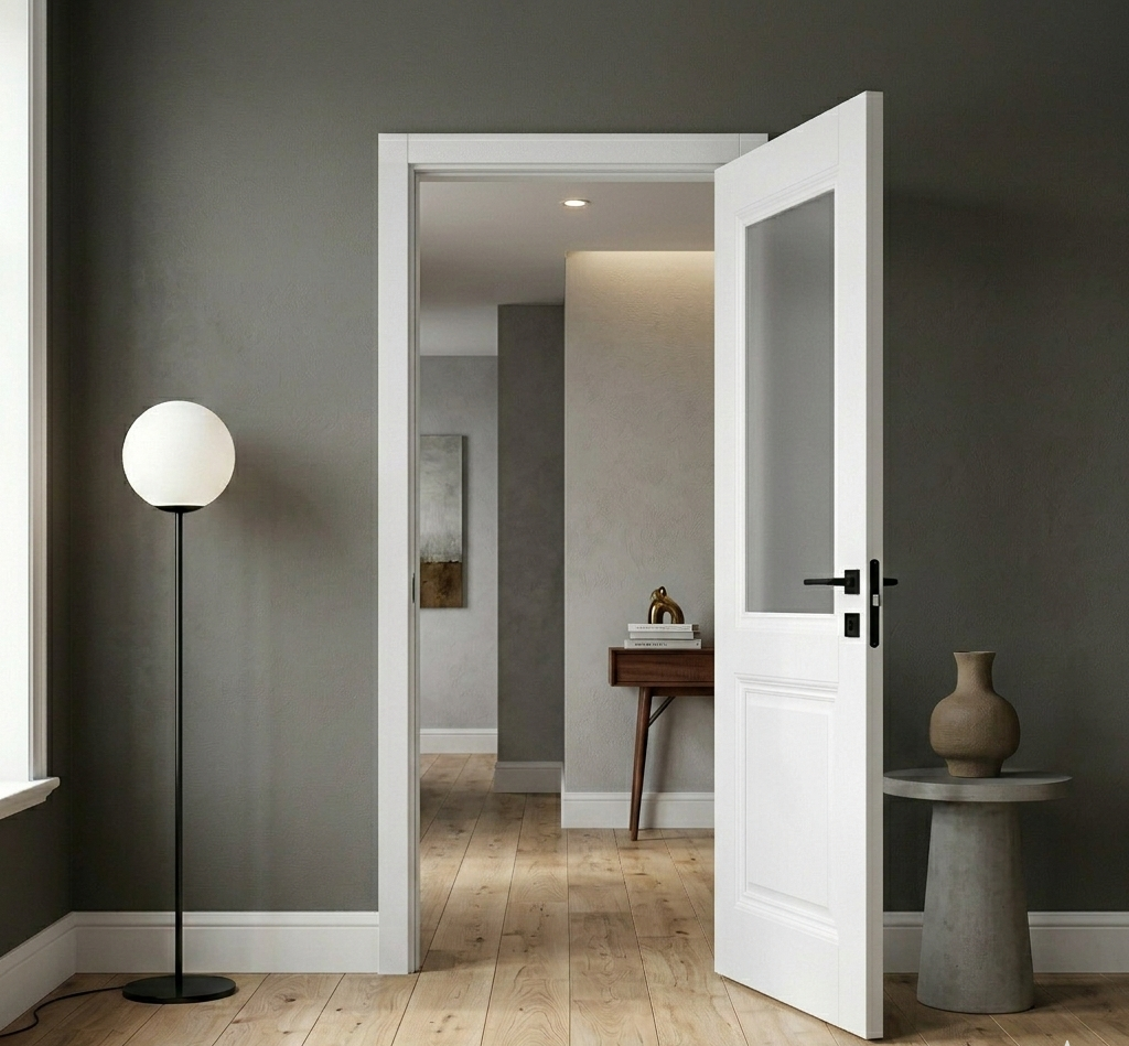 Ușă de interior albă JYA-067 cu sticlă satinată