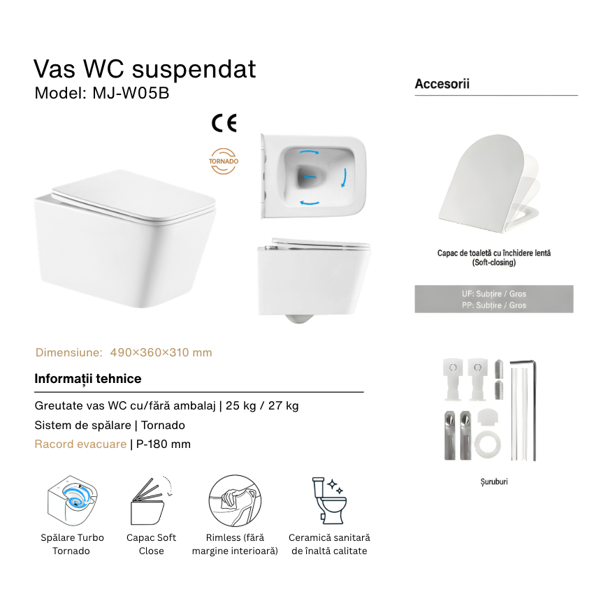 Sistemul Turbo Tornada oferă o spălare completă și igienică, cu jeturi direcționale puternice care asigură curățare eficientă și consum redus de apă.
